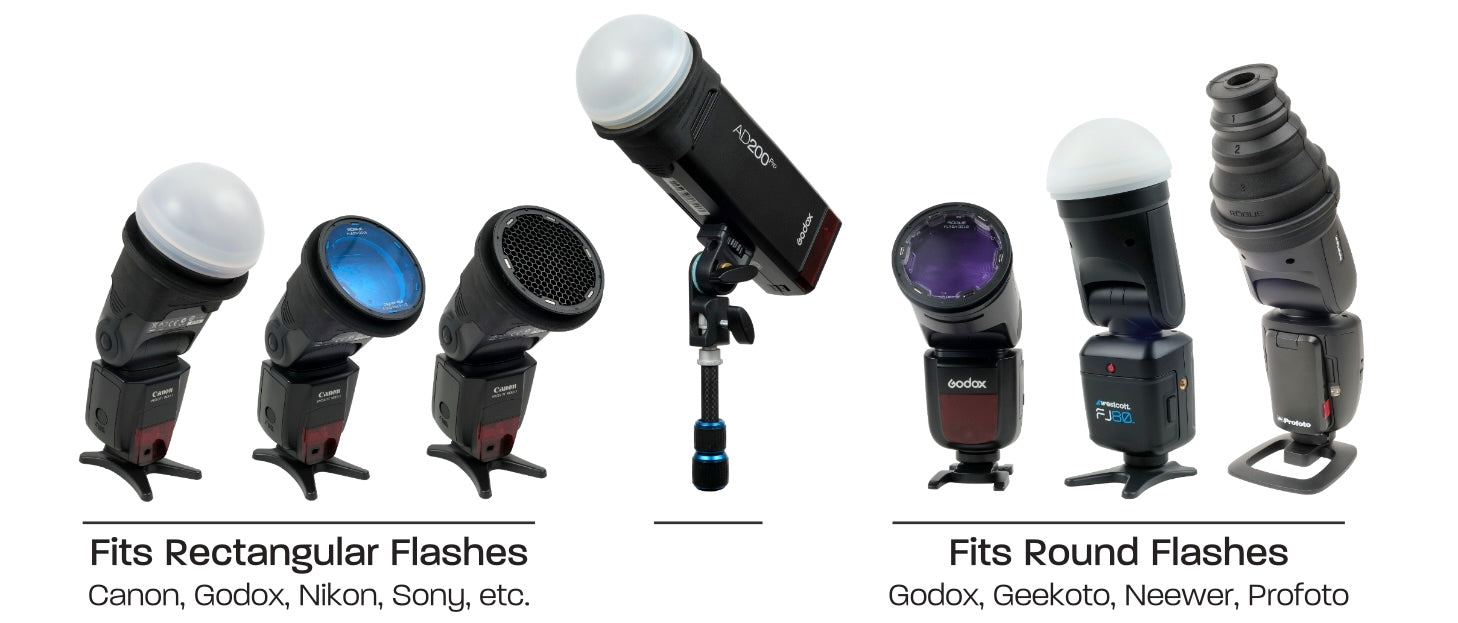 Rogue Round Flash Magnetic Modifiers snap directly to round flashes without any additional mount or to rectangular flashes via the Rogue Flash Adapter. Quickly and securely stack multiple grids, gels, or a dome diffuser to your flash. Everything is small, light, and durable.